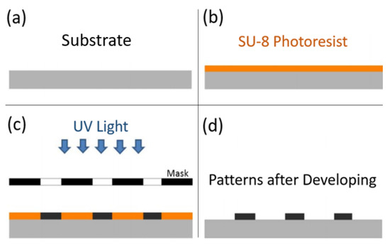 A negative photo-resist is placed on the substrate and then rotated at 4500 rpm for 30 s. Then, the substrate is placed on a hot plate for pre-baking. The purpose of the pre-bake is to eliminate excess coating solvent and harden the photo-resist. The patterns are then transferred from the mask to the photo-resist using UV exposure. Lastly, the substrate is dipped into a developer for about 4 to 5 min. The part exposed to the UV light remains while the other part gets dissolved [37].
