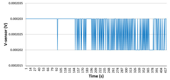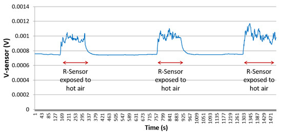 In order to demonstrate the operation of sensor revision 0.3, the voltage across the sensing element is measured at different applied heat values at the proximity area of the sensing element. The measured voltage is proportional to the sensing element resistance, which is a function of its surrounding temperature. Figure 14 presents the sensor’s output voltage overtime at different conditions: readings at room temperature, then readings while exposed to around 340 degrees kelvin hot air.