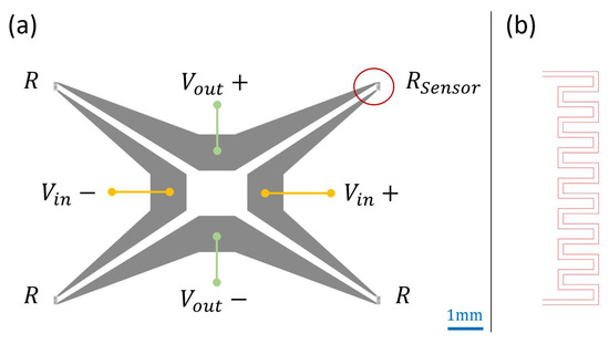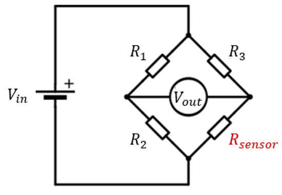 In order to solve the issue faced in design revision 0.3, a Wheatstone bridge is used to accurately measure the resistance change when the temperature around the sensor changes. A Wheatstone bridge can be used to convert a small sensor’s resistance change, due to a surrounding small temperature variation, into an accurate output voltage across the sensing element [38,39]. As shown in Figure 15, one pair of the bridge pads is used to apply a DC voltage, in our case = 0.5 V, and the other pair is used to measure the output voltage. The relationship between , and are given in Equation (1).