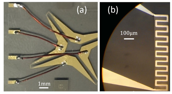 Several materials have been used to fabricate the device, including aluminum and gold. The picture in Figure 17a shows a fabricated sensor using gold. All sensor patterns were deposited on a glass substrate. Thin copper wires have been used to connect the bridge to Vin and Vout. A close up of the sensing element is presented in Figure 17b.
