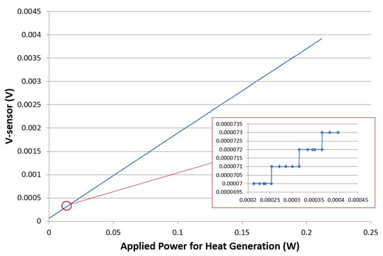 Several devices, with design revision 1.0, have been micro fabricated using gold to validate the different proposed enhancements. The bridge output voltage has been measured while applying a constant heat at the surrounding of the sensing element (Figure 18). It can be observed that the sensor reading is stable with a maximum error of 1 V. Compared to the results obtained for sensor revision 0.3, with a reading error of 0.2 mV, the usage of Wheatstone bridge in design revision 1.0 improved the reading accuracy by a factor of 200 times.