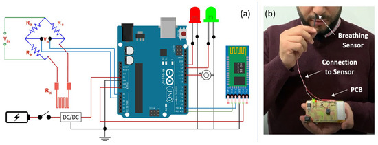 Several types of equipment are used to determine the performance of the RTD based sensor. The block diagram of the system and the measurement setup is shown in Figure 20a,b, respectively. A printed circuit board (PCB) was constructed and several electronic components such as LED, Buzzer, Battery, Arduino UNO, Bluetooth module, Resistors, Capacitors, RTD sensor, Voltage regulator and Switch were connected. The sensor is placed inside the patient’s nose, which is able to read the breathing frequency. The Arduino board reads the signal coming from the RTD sensor and sends the data via a Bluetooth module to a PC for further analysis.