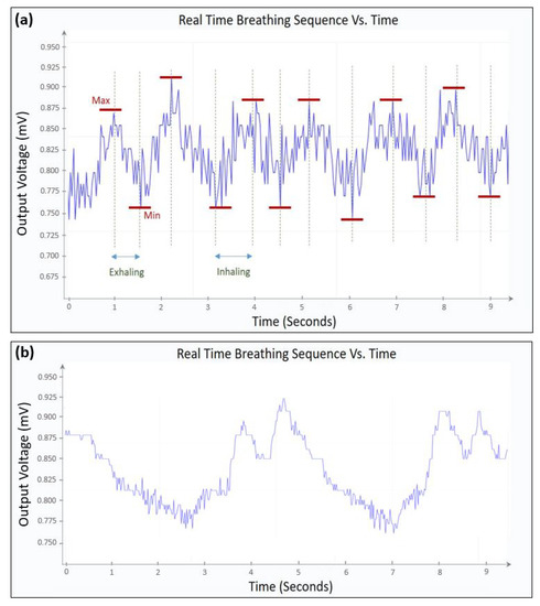 In Figure 21a the decrease of the output voltage from “max 1” to “min 1”, corresponds to a decrease in the sensing resistance, which indicates that the temperature is decreasing, demonstrating an inhaling pattern. On the other hand (assuming that the room temperature is lower than the body temperature), the increase of the output voltage corresponds to an increase in the sensing resistance, which indicates that the temperature is increasing, demonstrating an exhaling pattern. The recorded results in Figure 21a indicate that the patient has an estimated breathing frequency of 0.48 Hz. On the other hand in Figure 21b, the estimated breathing frequency is around 0.22 Hz, corresponding to a relatively low breathing frequency, which could be the case of a patient quietly breathing, known as “Eupnea”. These results are reinforced by the study presented in Reference [40].