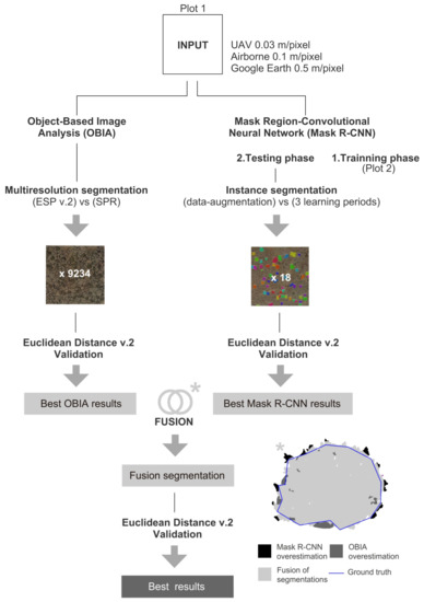 The analysis of very high-resolution images to detect and measure vegetation cover and its spatial arrangement across the landscape starts typically by segmenting the objects to be identified in the images [7]. Object-Based Image Analysis (OBIA) [15] and Mask Region-based Convolutional Neural Networks (Mask R-CNN) [16] are among the most used and state-of-the-art segmentation methods. Though they provide a similar product, both methods rely on very different approaches. OBIA combines spectral information from each pixel with its spatial context [17,18]. Similar pixels are then grouped in homogenous objects that are used as the basis for further classification. Mask R-CNN, on the other hand, a type of artificial intelligence whose functioning is inspired by the human brain provides transferable models between zones and semantic segmentation with unprecedented accuracy [19,20]. Besides, fusion has recently been used to improve spectral, spatial, and temporal resolution from remote sensing images [21,22,23]. However, the fusion of methods for vegetation mapping has not been evaluated.