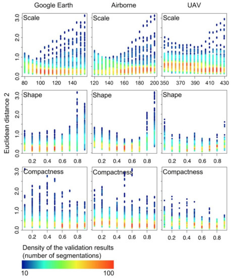 Relationship between Scale, Shape and Compactness parameters (X axis) evaluated using Euclidean distance v.2 (ED2; Y axis) in 9234 Object-based image analysis (OBIA) segmentations from Google Earth, Airborne and unmanned aerial vehicle (UAV) images. The rainbow palette shows the density of validation results. In red high density and in blue low density.
