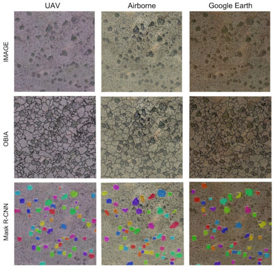 The spatial resolution of the images affected the accuracy of the segmentation, providing outstanding results in all segmentation methods and spatial resolutions. However, according to [57], we observed that the spatial resolution and Scale parameter played a key role during the segmentation process and controlled the accuracy of the final segmentations. In non-fusion segmentation methods (OBIA or Mask R-CNN) the segmentation accuracy was higher in the spatial resolution image from UAV and OBIA up to ED2 = 0.05. However, when the object to be segmented is larger than the pixel size of the image, the spatial resolution of the image is of secondary importance [37,57,76,77]. For this reason, as the scattered vegetation in this area presents a mean size of 100 m2 [5], corresponding to 400 pixels of Google Earth image, only slight increases in segmentation accuracy were observed as the spatial resolution increased. Moreover, the overestimation of the area of each shrub was not significant as the images spatial resolution increased. Therefore, Google Earth images could be used to map scattered vegetation in drylands, if the plants to be mapped are larger than the pixel size. This result opens a wide range of new opportunities for vegetation mapping in remote areas where UAV or airborne image acquisition is difficult or acquiring commercial imagery of very high-resolution is very expensive. These results are promising and highlight the usefulness of free available Google Earth images for big shrubs mapping with only a negligible decrease in segmentation accuracy when compared with commercial UAV or airborne images. However, the segmentation of vegetation could be better if we use the near infrared NIR band since vegetation highlights in this range of the spectrum (e.g., 750 to 2500 nm) or used in vegetation indices such as the normalized difference vegetation index (NDVI) or Enhanced vegetation index (EVI). Finally, very high spatial resolution UAV images need much more computational time and are expensive and not always possible to obtain at larger scales in remote areas, hampering their use.
