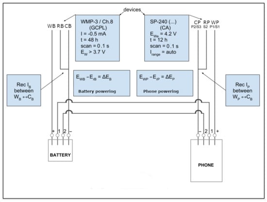We have thus connected the battery of the smartphone by using a second potentiostat VMP-3 and adding the battery of the smartphone to the circuit. This is shown in the left-hand side of Figure 3. The control pins of the battery (i.e., pins 1 and 2) are connected to the related pins of the smartphone. The battery is fully charged and it is connected to the VMP-3 potentiostat. The VMP-3 device ensures the potential difference E B (i.e., E B = E W B E r B ) between the potential E W B of the working electrode (WB) and the potential of the reference electrode (RB) is kept constant at 4.5 V, which is the potential value needed for fully charging the battery, and is a value higher than the 3.7 Volts needed for turning on the smartphone. The VMP-3 potentiostat reads between the electrodes (WB) and (CB) a relatively low current of the order of −0.5 mA, close to the low current detection limit, confirming that the potentiostat is giving current to a battery which is close to its fully charged state and requires only minimal amounts of energy for monitoring of internal parameters.