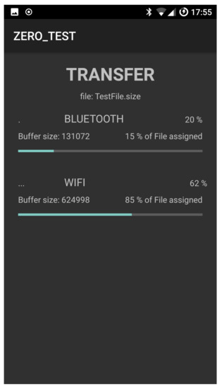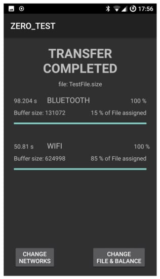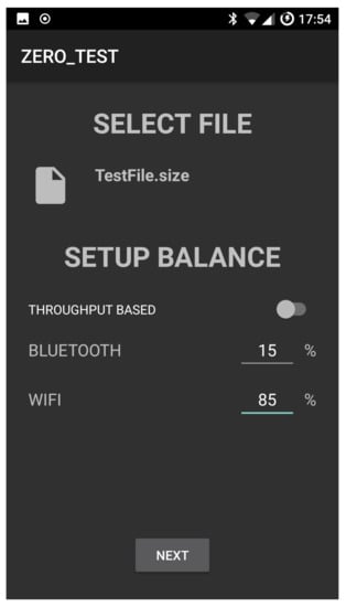 The AUTO mode divides the file to be transferred into different parts and allows the selected communication interfaces (e.g., Bluetooth and WiFi in our example) to transfer available parts by using their maximum transmission rate. As we are going to see in the experimental results section, manual setup balance is useful to interpret the results that are obtained by using the AUTO mode.