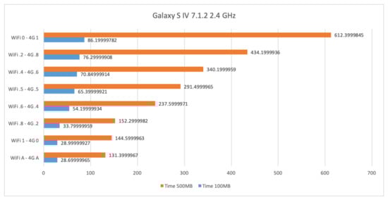 Figure 14. Time required for transferring files of size 100 Mb and 500 Mb by means of WiFi at 5 GHz and 4G on a Samsung Galaxy S4.