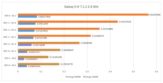 Figure 13. WiFi at 2.4 GHz and 4G energy consumption results for the Samsung Galaxy S4.