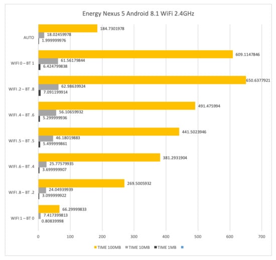 Figure 16 shows the time required for sending files of size 1 Mb, 10 Mb and 100 Mb by using WiFi at 2.4 GHz and Bluetooth on the LG Nexus 5. The time to transfer 1 Mb, 10 Mb and 100 Mb is 6.42, 61.56 and 609.11 s, respectively, when only Bluetooth is used. Such results decrease to 0.80, 7.413 and 66.3 s, respectively, when only WiFi is used. The AUTO mode requires more than the double of the time spent by the stand-alone WiFi setup. This confirms the bad behaviour of WiFi at 2.4 GHz concerning interference.