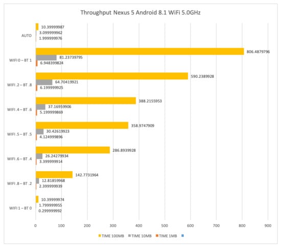 In this section, we show and comment on results obtained for file transfers by means of interfaces WiFi at 5 GHz, Bluetooth, and their combination on the LG Nexus 5 with Android 8.1.