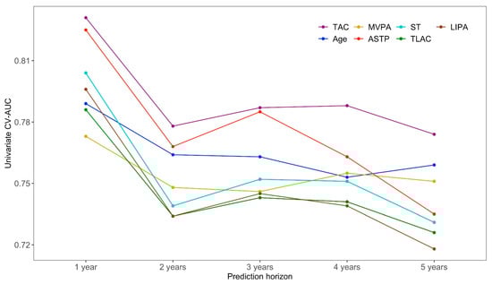 Figure 1 displays the CV-AUC for the top seven predictors in the five-year univariate mortality model across each prediction horizon (one- to five-year all-cause mortality). All predictors had large CV-AUC across all prediction horizons (note the y-axis scale) and included six accelerometry-derived physical activity measures (TAC, MVPA, ASTP, ST, TLAC, and LIPA) and age. The total activity count (TAC, shown in violet in Figure 1) was consistently the top-ranking predictor in all prediction horizons with the corresponding CV-AUC decreasing from 0.831 in the one-year all-cause mortality model to 0.774 in the five-year all-cause mortality model. The second highest ranking predictor in the five-year mortality model was age (shown in dark blue in Figure 1) with CV-AUC 0.759, though it was outperformed in some time horizons by ASTP (one- to four-year), sedentary time and LIPA (one-year mortality), and MVPA (four-year mortality). The third through seventh ranking univariate five-year mortality predictors were the accelerometry-derived physical activity measures MVPA, ASTP, ST, TLAC, and LIPA, respectively. The rankings of these predictors changed slightly across prediction horizons, though they always stayed among the top seven predictors of mortality. Similar CV-AUC results are provided for the other, lower ranked, traditional predictors and accelerometry-derived physical activity measures in Table A2 of the appendix materials.