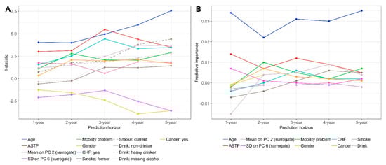 Panel A in Figure 2 displays the t-statistic values for all variables in the combined model across years. Larger absolute values of the t-statistic correspond to stronger statistical evidence against the null hypothesis that a particular variable is not associated with mortality. Age, shown in blue with t-statistics values approximately in the range of 4 to 6, and ASTP, shown in red with t-statistics approximately in the range of 3 to 5, have the largest positive values of the t-statistic across years one through four. For year 5 the t-statistic for drinking is larger than for ASTP, though the t-statistic for ASTP is still large (3.497). This indicates that older individuals with more frequent transitions from active to sedentary activities have a higher mortality risk. Coronary heart failure (CHF), shown in light blue, has consistently high t-statistics values in years 2 through 5 (values between 2.519 for year 2 and 3.462 for year 5). These t-statistics are also the highest among variables quantifying comorbidities. This indicates that CHF is among the most predictive comorbidities for mortality across multiple time horizons. The smaller t-statistic for CHF for year one is likely due to the low number of study participants who died in the first year and had CHF at baseline (n = 9); for more details, see Table A3 in the Appendix. Gender has the smallest negative t-statistics (large in absolute value) in years three through five (–2.418, –3.946, and –3.596) indicating that being a female is statistically associated with a reduced risk of mortality in these time horizons. Similarly, the surrogate for the standard deviation of the sixth principal component, has the smallest negative t-statistics (large in absolute value) in years one and two. The surrogate for the standard deviation of the sixth principal component was computed as the standard deviation of the difference in average log-transformed activity counts comparing the time intervals (8 a.m.–10 a.m., 3 p.m.–5 p.m., 10 p.m.–12 a.m.) to (5 a.m.–7 a.m., 11 a.m.–1 p.m., 6 p.m.–8 p.m.) [].