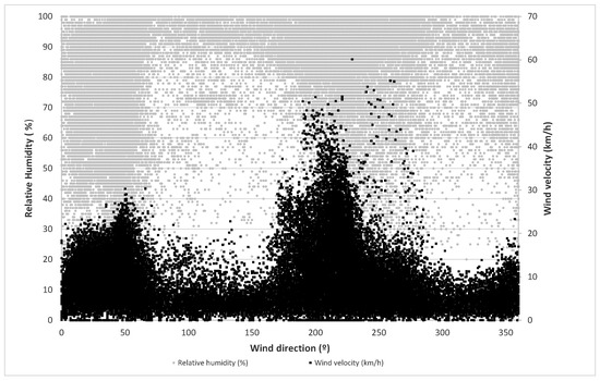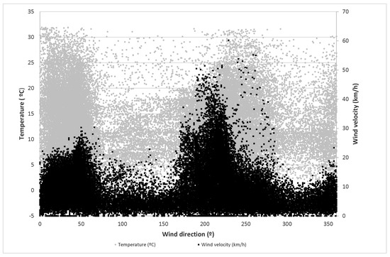 Finally, the values of temperature, wind velocity and relative humidity versus wind direction are represented in Figure 1 and Figure 2. In these figures, it can be observed that most of the highest velocity values appear at the orientation of 220°. At the same time, most of the highest temperatures and lowest relative humidity occur in the orientation intervals between 0° and 60° and between 200° and 260°.