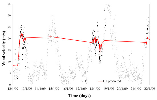 Temperature and wind direction were modelled for the month of January to predict the limit of wind speed at which anemometer failure (error 2) happens. Modeling obtained a monthly determination factor of 0.95. This error modelling can be observed in Equation (8) and shown in Figure 5.
