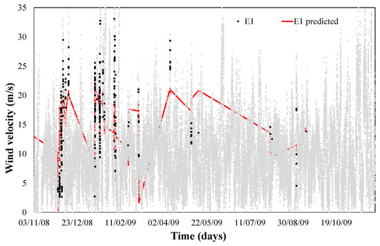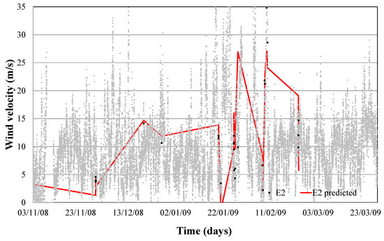 When this model is tested over a yearly period, a determination factor of 0.65 was obtained, as we can see in Figure 6. Thus, when wind with determined humidity, direction and temperature presents a certain speed, we would enter the risk zone of failure 1 and 2, as shown in Figure 6.