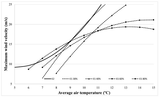 As we can see from Equation (7), error 1, which is an external error, is related, in accordance with ANOVA analysis, with all the climatic conditions. If each model is represented to define the minimum wind velocity at which each error may happen at different levels of relative humidity, Figure 7 is obtained.
