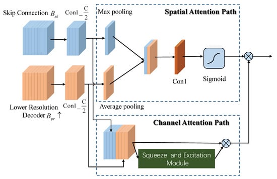 In convolutional U-net, the decoder fuses feature maps from FAE with skip connection along with the feature maps from lower-resolution decoder. In order to increase feature representation power, we propose dual-path attention models by blending cross-channel and spatial information together. Now, as illustrated in Figure 2, we will detail the two attention models as follows. (1) Spatial attention path. Inspired by [36], we use max-pooling and average-pooling along the channel axis to extract spatial attention. For the branch of FAE with skip connection with C channels, max-pooling operation and convolution are applied to generate the feature descriptor denoted by . For the branch of lower resolution decoder with C channels, average-pooling operation and are applied to compute the average statistics of all channels denoted by . The above and are concatenated and forwarded to a convolution layer followed by a sigmoid function, generating spatial attention map . Besides, as described in Equation (2), the concatenation of and is scaled by to obtain spatial-aware feature map .