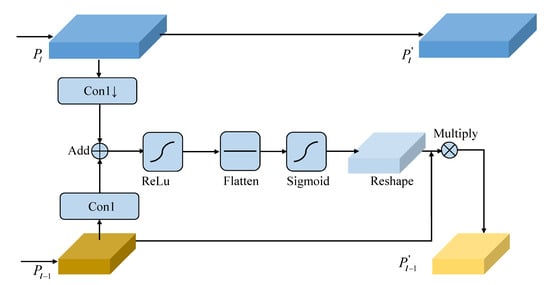 A good attention module can help the detector to perceive indistinguishable constitution, such as steel element in multiple-phase metallographic images. To implement this, we replace the above pyramid level with an attention-aware lightweight feature pyramid (ALFP). In Figure 5, we consider the context between adjacent feature maps and then use an attention map to increase the receptive ability of pyramid features. In detail, a pyramid level is denoted as where l is the level number and it has resolution of the input image. is the feature stride and . At first, two pyramid levels and are all passed through convolutions to align along the channel dimension. Then, is downsampled and then concatenated by followed by ReLu activation function.