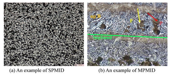 To facilitate the learning of the proposed models, we have prepared two new metallographic image datasets that cover single-phase and multi-phase types. All the images are collected and built with Zeiss intelligent microscope Axio Imager A2m under the optical microscopy 100× magnification. In terms of Single-Phase Metallographic Image Dataset (SPMID), we treat the microscopic images of cross section of hot rolled section steel 20G as our observations. Based on carbon level (level A~E) and segregation degree (degree 1~5), we illustrate the distribution of all the samples in Table 2. Through the segmentation results of SPMID, we can explore the roundness of MC-type carbide, which could be used for quality evaluation of steel production. The dataset includes 7500 training images, 500 validating images and 1433 testing images. In view of Multi-Phase Metallographic Image Dataset (MPMID), we build it on the longitudinal section of round steel 42CrMo. As shown in Figure 6b, the sample contains a series of structures such as upper bainite (up B), ferrite (F), pearlite (P) and segregation band (Segband). Apparently, the sizes of those objects have large differences. For each sample, Segband is much larger than up B. We annotate all the structures by drawing an bounding box around target object with annotation tool-LabelMe. With the well-trained detector, we can easily evaluate steel quality by calculating the statistics of constitutions. To prevent overfitting, horizontal image flipping is utilized in data augmentation. In total, we use 6500 metallographic images for training, 500 images for validating and the remaining 1000 for testing. In Table 3, we count the proportions of F, P, up B, Segband and background in dataset MPMID. As can be seen, the distribution of data samples is biased and imbalanced. The F elements make up nearly 41.8% while the up B elements are in the minority.