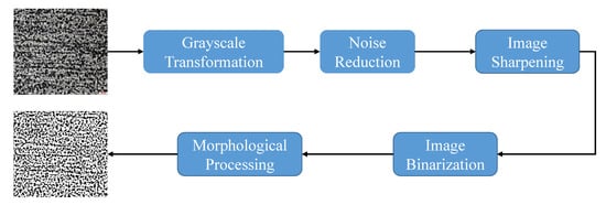 With the purpose of obtaining better result, it is necessary to carry out preprocessing procedure for removing noise and enhancing quality. As illustrated in Figure 7, we apply a series of operations to the above two datasets. (1) Grayscale transformation. To enhance image quality and reduce computation cost, as a preliminary step, the metallography in RGB is transformed to grayscale format. (2) Noise elimination. During acquiring metallographic samples, there are undesirable noise and digital artifacts caused by microscope equipment and operating environment. With the presence of noise, the subsequent image processing tasks, image segmentation or object detection, are adversely affected. As an effective and efficient method, Robust PCA has been widely used for denoising in different fields [42,43]. In fact, RPCA (Robust PCA) only works well when the noise is in accordance with sparse and low-rank representation. If we directly apply it to our datasets, the subtle microstructures will be removed. Thus, we propose Patch-constrained Robust Principal Component Analysis (PRPCA) denoising algorithm which adds patch constraint to the following objective function.