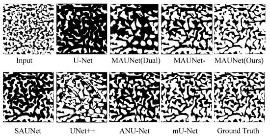 We present the results of ablation study in Table 4. From the results, it can be observed MAUNet(Dual) consistently outperforms U-Net on all metrics. This improvement is attributed to the dual-path attention. Using module FAE, MAUNet- increases the IoU by up to 0.228 points, which meets the expectations for the design in Section 3.1. With the help of common-used tricks, MAUNet could achieve slightly better performance than MAUNet-. Besides, we take a closer look at the ablation study in the first row of Figure 8. From empirical observation, MAUNet(Dual) could focus on the location of carbide when compared with U-Net. After introducing FAE module, we find that MAUNet- is more successful in fine detection of edges or the shape of carbide. Furthermore, the removal of overlapping strategy and other tricks used in MAUNet aids in refining the details of carbide, providing a closer segmentation result to the ground-truth. Therefore, we can safely draw the conclusion that our model offers more accurate results than other methods quantitatively and qualitatively.