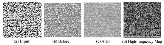 The visual feature maps and the high-frequency map. (a) Input image (b) The feature before the last downsampling layer (c) The feature after the last downsampling layer (d) High-frequency map.