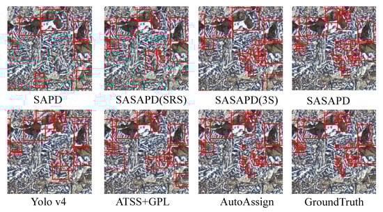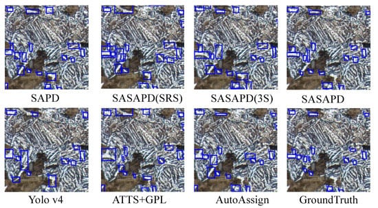 As summarized in the top half of Table 5, comparable results are achieved to verify the effectiveness of each component of the proposed SASAPD. When compared with SAPD, 6.7% Dice, 5.9% Precision, and 7.4% Recall values are gained by SASAPD to identify pearlite (P). The role of SRS puts emphasis on positive samples, which facilitates the improvements on metrics Precision(P) and Precision(F). Next, we study the effect of 3S strategy and apply it to SASAPD(SRS). As long as each instance is assigned to more pyramid levels with self-adaptive weights, we find that SASAPD(3S) obtains 2.23% Dice, 1.33% Precision and 3.07% Recall improvements over SASAPD(SRS) while detecting pearlite (P). To analyze the design of ALFP, we compare SASAPD(SRS) with SASAPD and report the result in Table 5. Since ALFP tends to perceive smaller objects, we find that it brings more improvements on the detection result of ferrite (F). Besides, we display the visual results of ablation study Figure 10 and Figure 11. SASAPD(SRS) is good at recognizing positive objects in larger size, and SASAPD(3S) is able to find more objects with the help of weighted pyramid features. However, the detection result of F obtained by SASAPD(3S) illustrated in Figure 11 has uncertain and inaccurate bounding boxes.