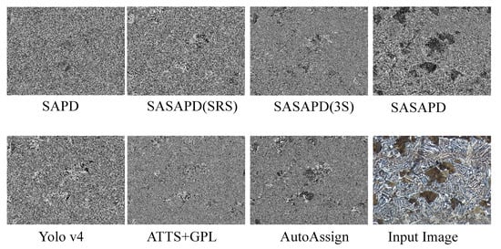 In order to understand the performance of all the models better, we demonstrate some detection results of P and F in Figure 10 and Figure 11. By introducing attention mechanism into pyramid level, SASAPD generates few false negatives as well as false positives for both P and F. ATTS+GPL suffers from false negative samples despite that it assigns different weights based on the location quality. The result of YoloV4 is affected by the detection error of smaller objects. We speculate that it mainly because the fixed weights are adopted in Spatial Pyramid Pooling(SPP). We also compare our SASAPD with AutoAssign, which also designs a reweighing strategy to boost detection performance. However, we see that the center weighting proposed in AutoAssign fail to recognize overlapped objects and false positive samples with similar appearances and shapes. Besides, we make a brief discussion about the discriminable ability of the features obtained by different models. From the results in Figure 12, it can be observed that SASAPD shows more discriminable features for identifying microstructure instance than the others. Therefore, it can safely come to the conclusion that SASAPD yields the closest results to the ground-truth in this experiment.