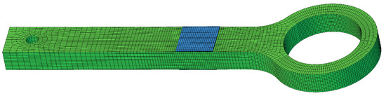 The cracks of length 2 mm at locations and are defined using the Abaqus seam functionality. Nodes at defined seams are duplicated, which creates an idealized crack without any gap [35]. Contact forces between crack faces are neglected.