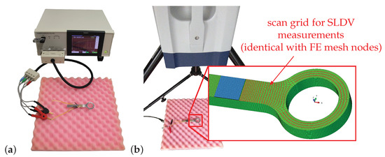 The first experimental setup is depicted in Figure 3a. The excitation amplitude for the measurement with the IMA (Hioki IM 3570) is . The frequency spectra (spectrum elements: conductance G and B) of PWAS1 are measured with a resolution of 125 Hz and for each frequency step 16 single measurement values are averaged. Figure 3b depicts the second measurement setup with the SLDV (Polytec PSV-500-HV). The excitation used for these measurements is a so-called periodic chirp signal (duration 64 ms) with an amplitude of . The frequency spectra (spectrum element: out-of-plane velocity ) were measured with a sample rate of (yielding a frequency resolution of Hz). The normal distance between SLDV laser head and the necked lug sample was 400 mm. The coordinates of scan points on the upper surface (i.e., the surface in positive z-direction on which PWAS1 is applied, see Figure 3b) and lower surface are exported from the FE mesh. For each scan point five measurements were taken and averaged to minimize the signal-to-noise ratio.