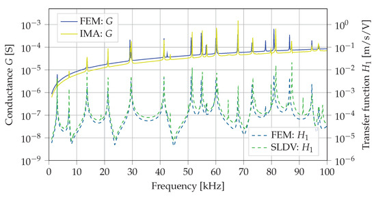 The results calculated with the finite element method (FEM) and measured with the IMA as well as with the SLDV are simple frequency spectra. For comparison of calculated and measured resonance frequencies these spectra are plotted in Figure 4 on two different logarithmic scales. On the left y-axis the calculated and measured conductance according to Equation (1) of the PWAS are compared. The right y-axis presents the calculated and measured mean amplitudes of the transfer function defined as