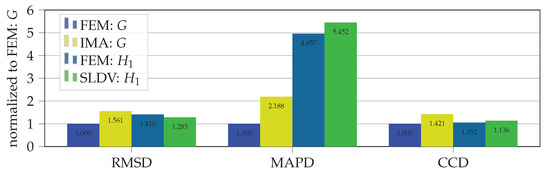 The values of damage metrics RMSD and CCD yield similar results, even though spectra with different elements (G and ) are compared. However, the values of damage metric MAPD differ from each other significantly. In particular, the damage metric MAPD of calculated spectra yields a four times larger value than for the calculated conductance spectra G. A closer look to Equation (7) for damage metric MAPD and comparing it to the other two damage metrics could explain this deviation. The numerator of MAPD holds the spectrum element of the pristine structure for each frequency step. This is in contrast to the other two damage metrics where the numerator holds a sum of all spectrum elements, which reduces the impact of large spectral deviations at single frequencies. Therefore, further analysis and visualization of results is based on the damage metric CCD, which shows the best correlation across compared spectra (FEM: G and , IMA: G, SLDV: ) in Figure 5.