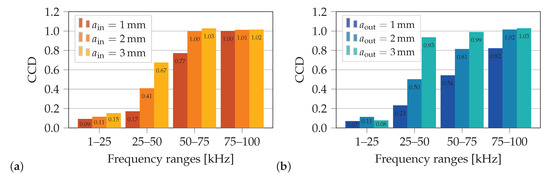 In Figure 6 values of damage metric CCD (computed with FEM) are compared for the two considered failure locations ( and ). To identify regions of the spectra, which are most sensitive to the considered damage (crack lengths ), the full spectrum range is divided into four parts: 1 kHz to 25 kHz, 25 kHz to 50 kHz, 50 kHz to 75 kHz and 75 kHz to 100 kHz. Subsequently, the damage metrics are calculated separately for each part of the spectrum. For both crack locations the damage metrics CCD yield highest values for frequencies above 50 kHz (this is also true for damage metrics RMSD and MAPD).