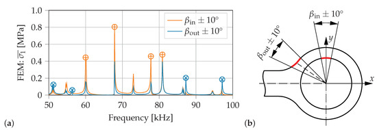 Besides using damage metrics, spectral features can also be used to identify structural changes [7]. In this contribution the considered structural changes are cracks, which initiate at two specific locations that show high stress concentrations at operational loads. After crack initiation cracks usually grow in directions perpendicular to the major principal stress [37]. As a crack reduces the stress in this major principal direction to zero at its face, it is assumed that vibration modes of the pristine structure that show a large major principal stress at a location of interest are also sensitive to the occurrence of a crack. Therefore, to identify resonance frequencies which are sensitive to occurring cracks at the two critical locations, spectra of mean major principal stresses are investigated. These mean stresses are calculated by averaging all FEM stress results , computed in coupled-field FE simulations (dynamic excitation of PWAS1 mounted on the pristine necked lug) on the surfaces over the whole thickness of the lug and within an angle of around both locations of possible crack initiation (, ), see Figure 8b. In Figure 8a the mean values of the major principal stresses are plotted in the frequency range of 50 kHz to 100 kHz. The spectrum of at the inside surface of possible crack initiation yields the highest resonance peaks, marked with ⊕ in Figure 8a. The most prominent resonance frequency appears at . At these resonances the pristine structure is deformed according to the excited mode shapes, which results in the highest major principal stresses (averaged over the area ) compared to other exited mode shapes at other resonance frequencies. A crack initiation in the area significantly reduces the local stiffness of the structure in this region. Hence, for the resonance frequencies marked with ⊕ in Figure 8 it is assumed that they are sensitive to cracks initiating at . Similar can be said for the spectrum of at the location of possible crack initiation at the outside surface . This spectrum yields smaller amplitudes for most frequencies. However, four resonance frequencies at , 56 kHz, 87 kHz and 97 kHz have higher stress amplitudes at the outside surface of possible crack initiation than at the inside surface of possible crack initiation (marked with ⊗ in Figure 8a).