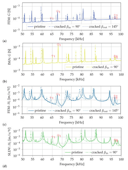 Subsequently, in Figure 9 pristine and damaged (cracks of length 2 mm at locations and ) state spectra are plotted in the frequency range of 50 kHz to 100 kHz. Figure 9a,c show frequency spectra calculated with coupled-field FE simulations. Figure 9b,d show frequency spectra measured with the IMA and the SLDV, respectively.