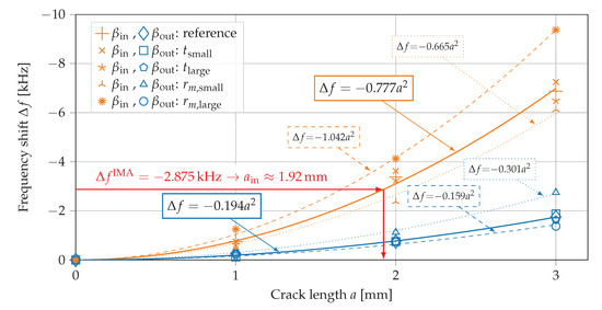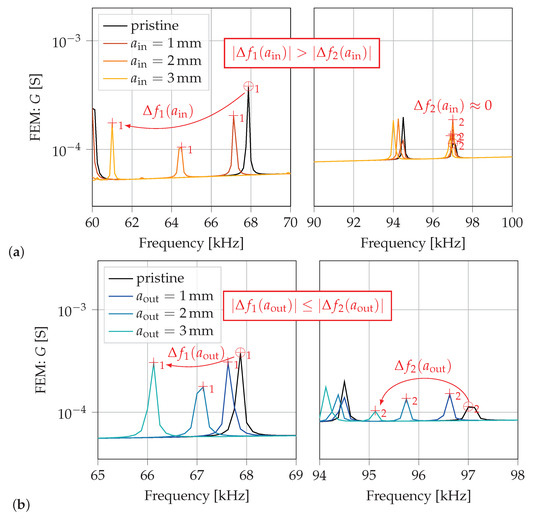 The presented model-based method (developed using coupled field FE simulations) is now checked using experimental measurements. Given the frequency shift of measured with the impedance analyzer yields an estimated crack size of , see Figure 12. This result fits well to the introduced crack length of 2 mm. The small deviation in estimated crack length may result from the finite width of the introduced crack (compared to zero crack width in FE models) or manufacturing deviations (e.g., actual crack length, roundness of lug ring).