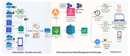 Figure 5 shows the IoCT proposed architecture for interconnecting an Internet of heterogeneous COVID-19 system of systems with the interoperable geospatial IoT technologies using OGC standards. The following sections summarize this architecture in three parts: Sensor and Data Extract, Transfer and Load,