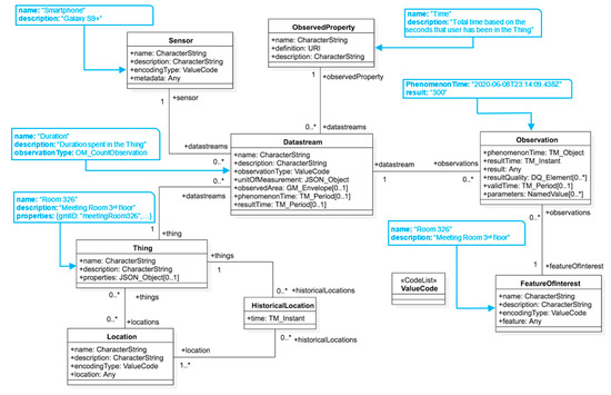 Figure 7 shows that “Duration” spent by a smartphone user in a room recorded within the proximity of a BLE beacon is considered a Datastream entity that kept the “Time” duration in seconds as an ObservedProperty. This Datastream entity used “Smartphones” as the sensor entity to keep Observations which are the duration of time that users spend in each cell in seconds.