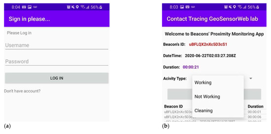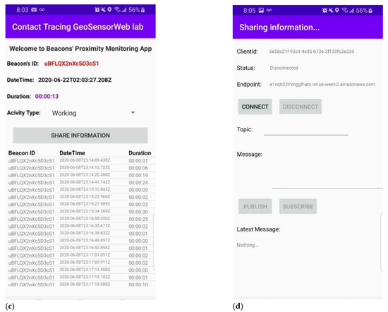 Figure 8b shows a screenshot of the developed mobile application for collecting different types of observations including BeaconID, time, date, and the duration that the target user spent in the proximal zone of each beacon. Assuming that the incubation period of COVID-19 is two weeks, the application will work as a background service that saves data internally for a two-week period.