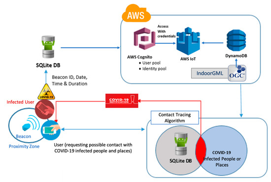 Figure 8d. All of the data related to the COVID-19 cases will be stored and managed in the DynamoDB database in the Amazon cloud. Our developed application was connected to the DynamoDB using another AWS product, the IoT Core. When new data is added to cloud storage, the contact tracing application will look for any matches between the backend data and the data stored internally in the user device. If it finds any matches that show that a confirmed COVID-19 positive case and the target user were close to each other for more than 15 min, the application will then notify the target user about potential exposure to COVID-19 and alert cleaning staff to disinfect the place. This process is shown in