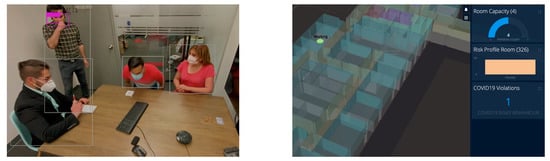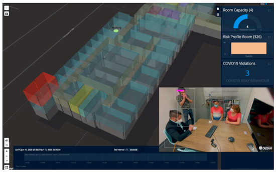 To demonstrate risk calculation using Equation (2), we evaluated the proposed IoCT using the following cleaning use case scenarios. In meeting room number 326 of the CCIT building, the number of people increased as people entered the room, and this event was detected by a smart camera in the room. The number of people was shown online in the video frame and map visualization browser in green until the room capacity (five) was reached. When the fourth person came in (room capacity is assumed to be three), the alarm notification for “Room exceeded capacity” is shown. After that, a person coughed in the meeting room, and this event was detected by both the smart camera and audio sensors. A notification showed “Cough detected”. Then, the person who coughed opened the door and this event was detected by the smart camera. A “High-risk behavior detected” notification was shown. The risk profile at that moment exceeded the threshold of 0.7 and a notification was sent to the people in room, and to a cleaner. The color of the room polygon turned red indicating high risk and the room polygon was extruded (i.e., the polygon height increases) proportional to the risk value. People started to leave the room causing the risk from People Density to go down, but the risk is higher than at the very beginning as a coughing event had occurred. The total risk value of the meeting room falls but remains higher than before the risky behavior (i.e., cough) took place. The cleaner closer to the room changes his activity status to cleaning (shown by an icon on the map) and moves closer towards the room (from elevator to room). The cleaner trajectory alongside the other people trajectories extracted from BLE beacons were visualized too. After the cleaning activity, the room’s total risk level goes back down to zero and the color of the room polygon changes back to green. The video demo of this scene is attached in the