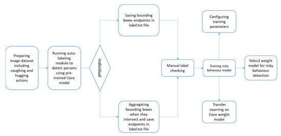 Figure 12 illustrates how to train a model for COVID-19 transmission risky behavior detection using YOLOv3.