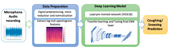 74]. Using multiple stacks of small kernel filters increases the network’s depth, which results in improving complex feature learning while decreasing computation costs. VGG16 architecture includes 16 convolutional and three fully connected layers. Audio-based risky behavior detection is based on complex features and distinguishable behaviors (e.g., coughing, sneezing, background noise), which requires a deeper CNN model than shallow architecture (i.e., two or three-layer architecture) offers [