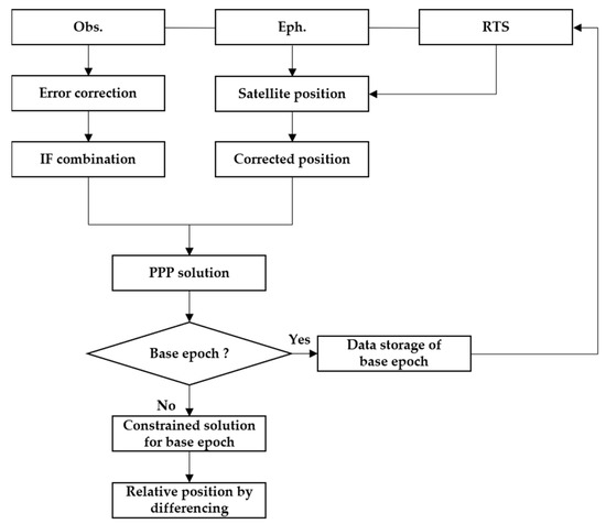 In order to overcome these issues, an improved time-relative positioning algorithm is proposed in this paper. The described algorithm uses the PPP model to estimate the parameters of current epoch, including position vector and ambiguities based on IF measurements. Then the estimated float IF ambiguities are used as constraints to estimate the position vector of the base epoch. Thus, the relative position between the base and the current epochs can be obtained by differencing the position vector between the base and the current epochs. As there is no approximation, differently from the traditional time-relative positioning method, the positioning accuracy is not affected by the initial position error. Meanwhile, the RTS products are used to constrain the satellite orbits and clocks, so that a high positioning accuracy is expected to be achieved. As described in previous paragraph, we considered the GNSS measurements to be free from cycle slips. In this work, both the Melbourne–Wübbena and geometry-free combination method and a robust Kalman filter were used to overcome this issue.