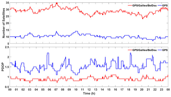 Figure 3 shows the number of visible satellites (having an elevation mask higher than 8°) and PDOP (positional dilution of precision) at HKLT station on the 3 March 2019, both for GPS and the combination of GPS, Galileo and BeiDou. There were about 10 GPS visible satellites in each epoch, even if the total number of visible GPS, Galileo and BeiDou satellites could even reach 35, which resulted in much smaller PDOP. Such a redundancy significantly increased the reliability and robustness of precise positioning.