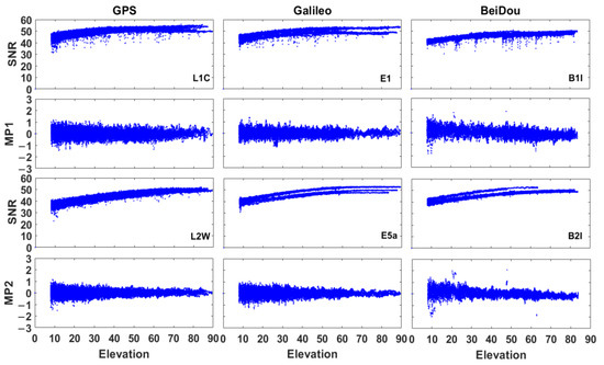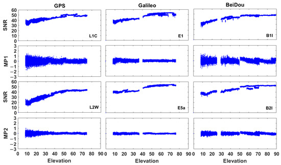 The signal-to-noise ratio (SNR) and pseudorange multipath (MP1/MP2) by using GPS, Galileo and BeiDou satellites were shown in Figure 4. The GNSS measurements were affected by interferences (such as multipath errors) as shown in Figure 4, even though the HKLT station is a continuous reference station.