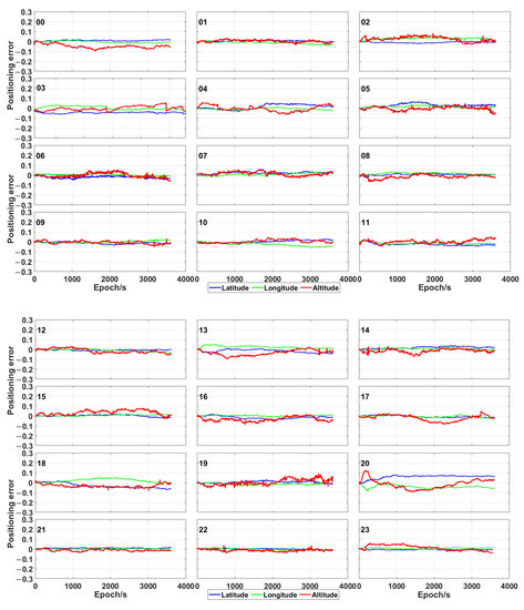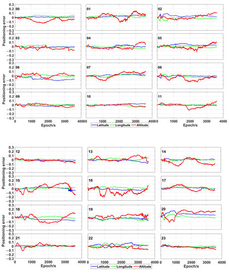 The plots in Figure 5 and Figure 6 show the positioning error of the proposed time-relative positioning method (the initial coordinates are estimated by using single point positioning method) for HKLT station by using only GPS satellites and GPS/Galileo/BeiDou ones, respectively. As shown in Figure 5 and Figure 6, the positioning error was uniformly distributed during each hour. There was no significant increase or decrease trend of the positioning errors related to longitude, latitude and altitude during each hour. Moreover, the 3D positioning error fluctuated up to 0.2 m during most sessions using GPS only. As expected, the positioning accuracy was significantly improved by using the combination of GPS, Galileo and BeiDou, as consequence of a higher amount of measurements and a more uniform geometrical distribution of the satellites (expressed by a lower PDOP in Figure 3). The positioning error was lower than 0.1 m for the combination of GPS, Galileo and BeiDou.
