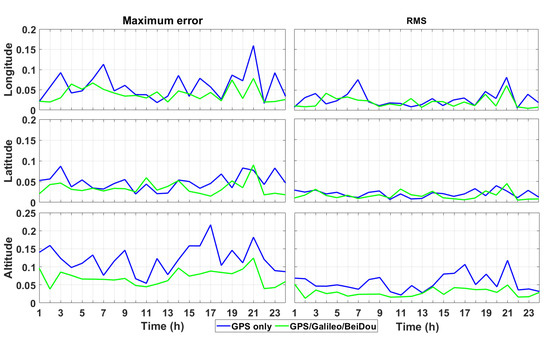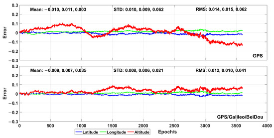 The results of the proposed positioning algorithm using only GPS and GPS/Galileo/BeiDou, respectively, are shown in Figure 15. By using only the GPS measurements, a positioning error (expressed as RMS) of 0.014, 0.015 and 0.062 m was achieved for longitude, latitude and altitude, respectively, while the maximum positioning errors were 0.044, 0.041 and 0.153 m, respectively. The positioning accuracy was also highly improved by the combination of GPS, Galileo and BeiDou. The positioning error, expressed as RMS, in one hour, was 0.012, 0.010 and 0.041 m for longitude, latitude and altitude, respectively. Meanwhile, the maximum positioning error and the standard deviation were much lower than those obtained by using only GPS for the three geodetic coordinates. The mean positioning error obtained by using multi-GNSS was also lower than that recorded by means of only GPS for the longitude and the latitude. Yet, a positioning error for the altitude, caused by unknown factors, resulted in a much higher mean value.